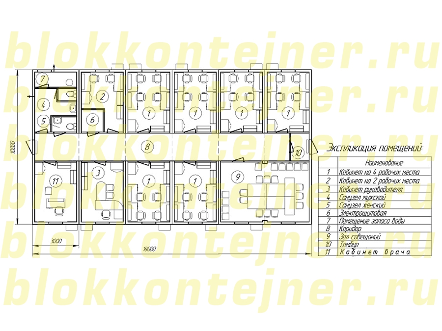 Модульное здание «Штаб строительства »   в 1-этаж, размер: (10,0 *19,6*3,0м) состоит из 16 единиц БК размер 4,0*2,4*2,5м: